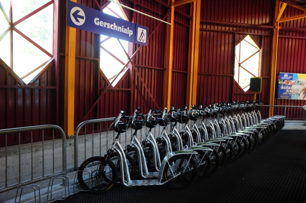 之後,我們就到車站去嘗試另一款玩意,叫 Trotti Bike,在此時 Peter 告訴我,先試試,若果有信心的話,我們就用這交通工具下山吧。我就在他的觀察下,簡單操作,此車比較輕盈,不妨說是滑板車及單車的混合物,雙腳要踏在直板上,然後剎車使用手掣,像單車左右兩邊。此路段是 Engelberg-Gerschnialp,全程落山,不過走車路,而最危險的地方是有機會遇上迎面而來的車。因此,Peter 說要確保我懂得剎車才起行。今次我終於可以示威,因為我不但掌握到它的剎車方法,也輕易的把它變成一塊很隨心所欲的滑板車,因為…我有一個秘密…其實我並非第一次操控此車,幾年前我曾經跟大夥兒來試玩過,當時還不時停頓及剎車,也有過驚險的情景,不過我記得上回的路線跟今次不太相同,也忘記曾經在何地體驗過。第二次玩 Trotti Bike,亦因為我必須趕及火車抵達前到山腳,結果全程只需 20 分鐘,比原定的 30 – 45 分鐘快得多,飛快的衝落山谷,曾遇過兩部貨車,也曾差點因剎車太快向前跌下。但在沒甚驚險的大前題下,安全着陸。
