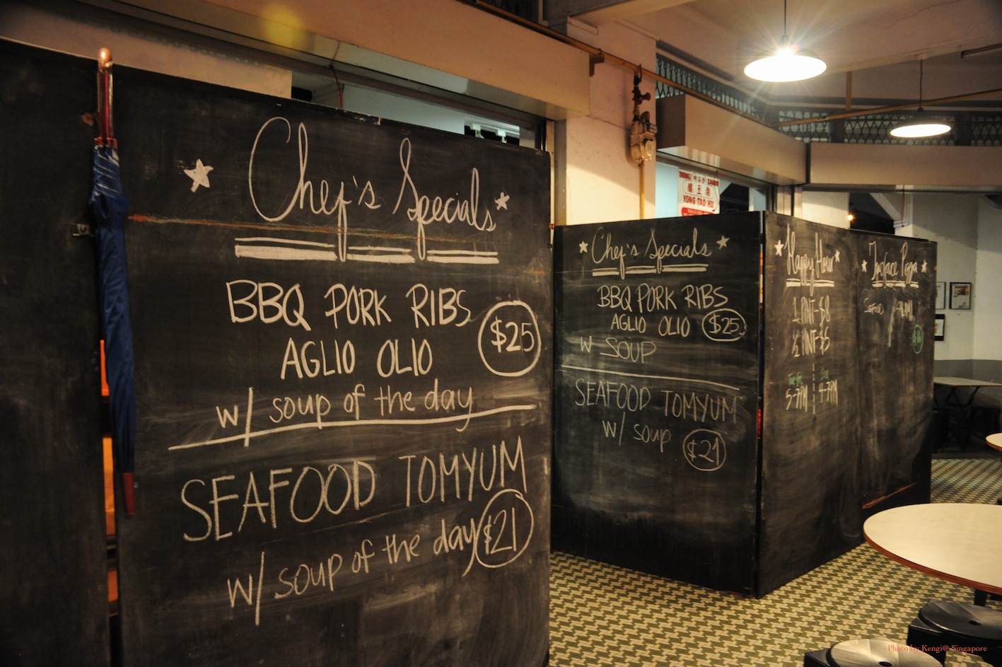 另一間值得提的是Two Face,顧名思義玩「變臉」,店舖本是幾夥小販齊齊經營的傳統麵擋,基本上2pm後就關門,晚上是丟空著沒用,於是對F﹠B有熱誠的Victor,看準了商機,懇求小販們把「晚市」出租予他,他每天為Two Face換晚裝。Two Face主理平價意大利菜,主菜是Pizza、Pasta、湯及Craft Beer,與及老闆自己也有份改良的果汁,一杯菜心汁,肯定會贏得創意大獎。至於Pasta亦常有廚師推介,例如當天是BBQ Rib pasta及冬蔭公pasta,價錢由$10-$25不等,在獅城,廉價的西餐不多,味道不算outstanding,但坐在街邊吃意大利粉的風味,加上有點Raw的平民風格,非常有趣。一檯「鬼妹」食客是常客,告訴我,她們幫趁過五次,最愛飲瑞典啤及新西蘭啤酒,亦大讚黑松露意粉出色。